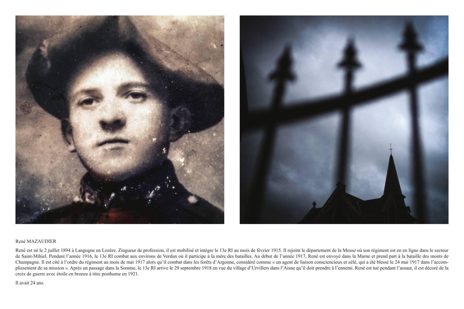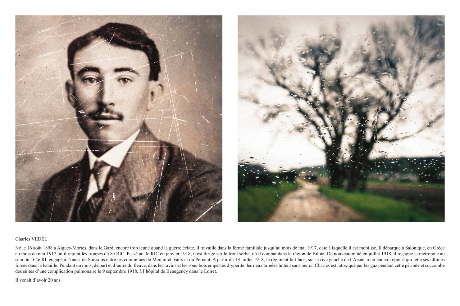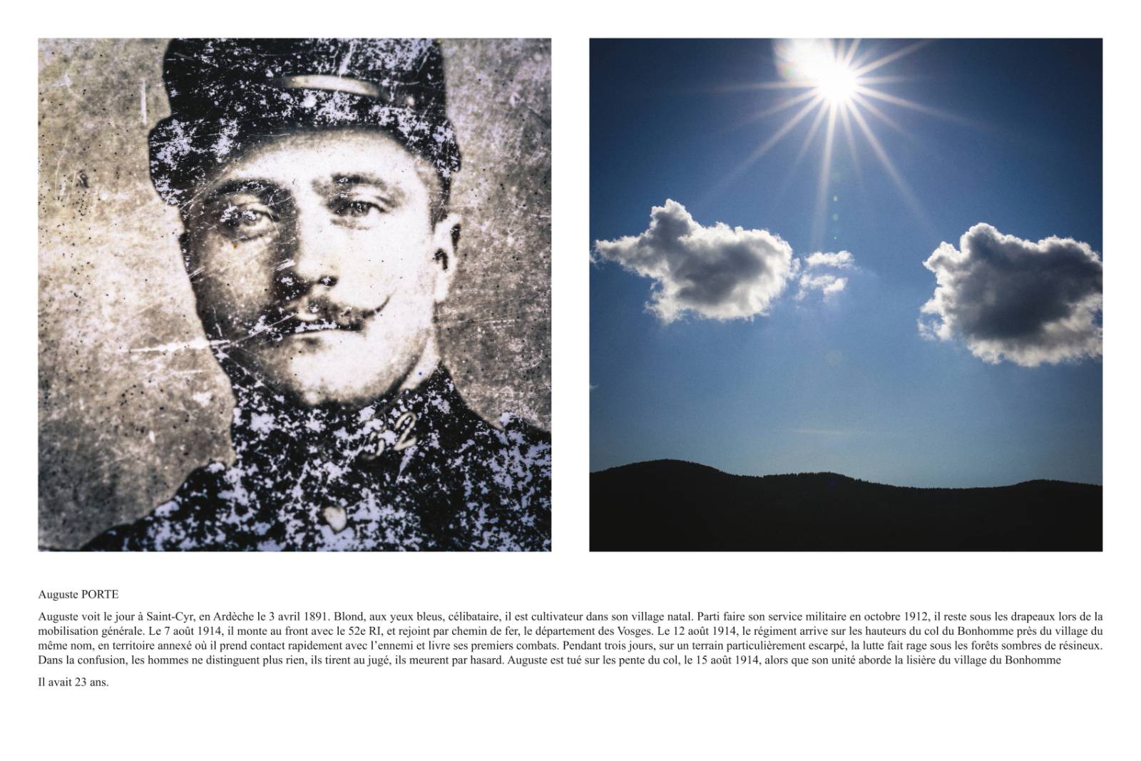Grâce à un travail mémoriel réalisé en diptyque et qui met en regard 2 photographies : celle d’un soldat et de son lieu de décès. Contraste saisissant d’un paysage confronté au visage d’un homme tombé au combat un siècle plus tôt. Je voulais découvrir qui ils étaient, en me plongeant dans les archives civiles et militaires, connaître leurs histoires et découvrir leurs «paysages linceuls».